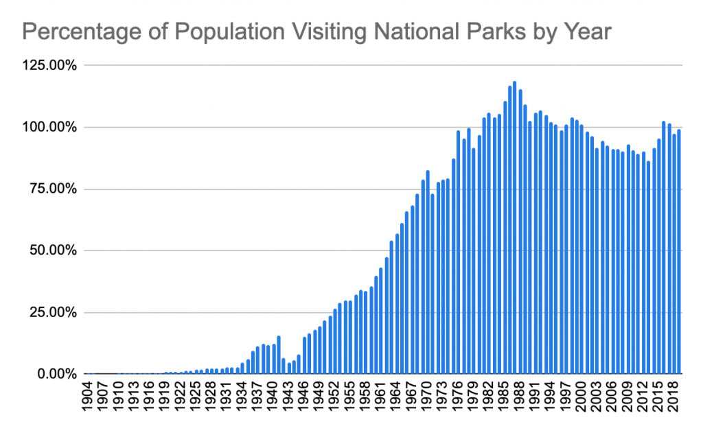 For me, a far more interesting statistic is the percentage of people partaking in a particular activity. Without this extra information, I don’t know how popular the activity is. When I cross-referenced national park visitation with population growth from the U.S. Census Bureau, an interesting statistic emerged.