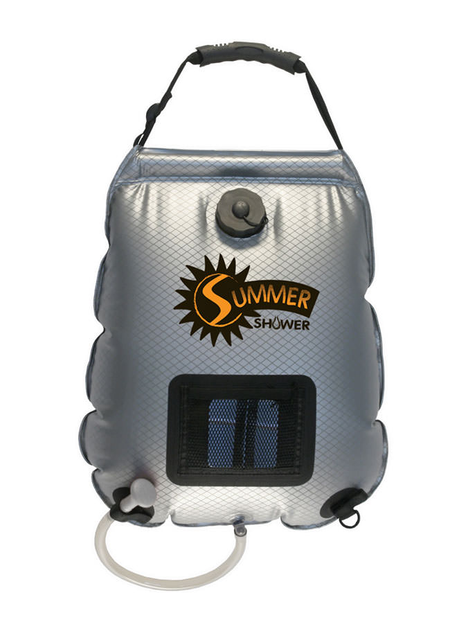 Harness the power of the sun to give yourself a hot shower anywhere you go! Designed with an efficient 4-layer construction for optimal heat retention and performance, the 5-gallon Summer Showerâ„¢ features an easy to use fill valve, easy on-off showerhead, water temperature gauge, reflective mirror, and a pocket for soap and shampoo.