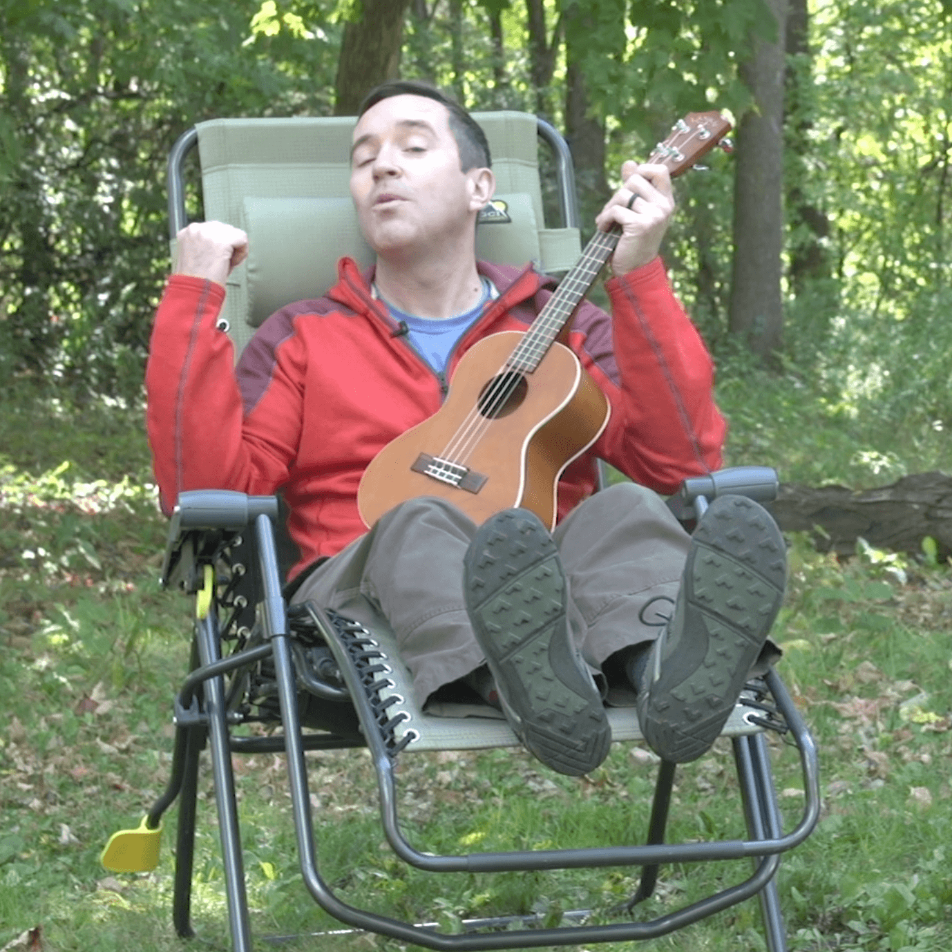 playing ukulele in a camping chairOn our last 50 Campfire Field Trip I did all of my strumming in the GCI Outdoor Freeform Zero Gravity Lounger. I can honestly say that it’s the most comfortable strumming chair I’ve ever used, primarily because I have have my legs up while the back is ALSO up. This meant that the ukulele could rest comfortably in my lap, making for effortless strumming sessions. Tons of fun!
