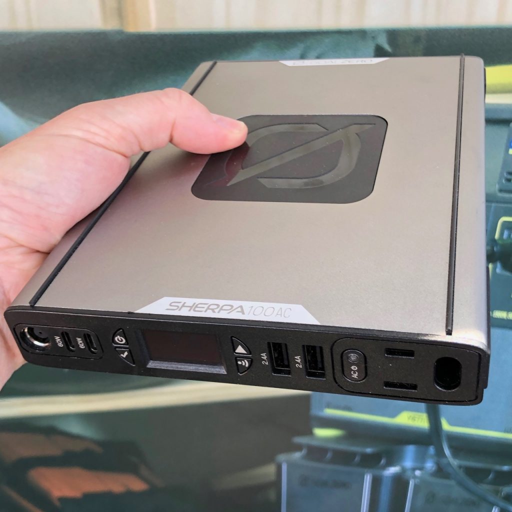 We often get questions about charging laptops at the campsite. People are looking for a portable solution, and the Goal Zero 100AC gets it done. It has a 100 Wh battery and only weighs two pounds. It’s the smallest battery they’ve ever made that has a 110V outlet, and for some campers or people who work in the field, it’s a great solution to that problem.