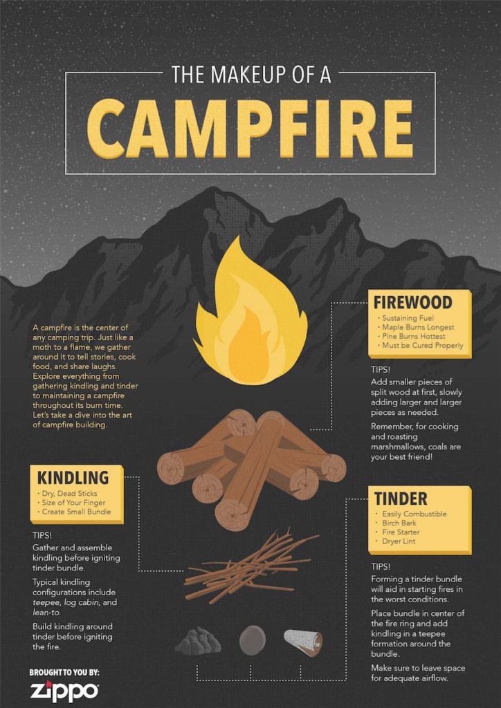 In the infographic below from Zippo, you’ll find everything you need to know about building a campfire from scratch. We cover the nuts and bolts of tinder, kindling, and fuel wood to make sure you spend less time building and maintaining your campfire and more time enjoying it. Make sure to check out the tips for each step!