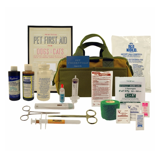 A kit that goes beyond the normal, everyday encounters a dog might have in the great outdoors, this kit also packs emergency stabilization items like a first aid book for dogs, skin staple gun, surgical scrub brush and syringe. In addition to the more extreme items, this kit includes the more basic items covered by more standard first aid kits, like  hydrocortisone cream, antibiotic ointment, gauze pads and more.