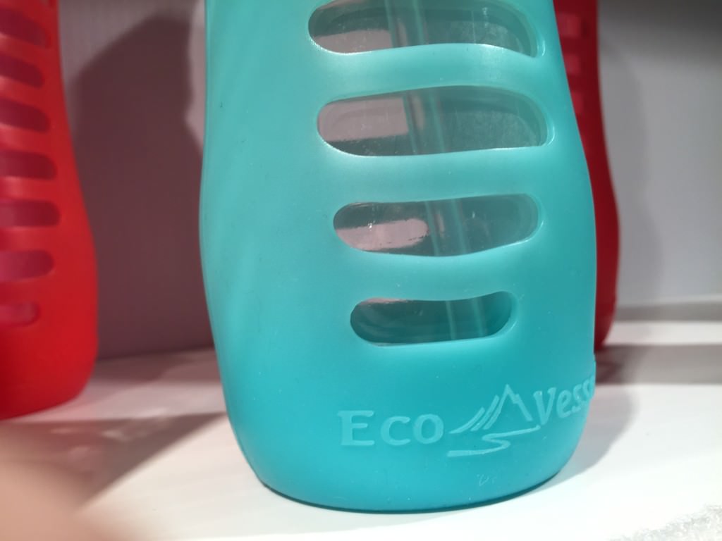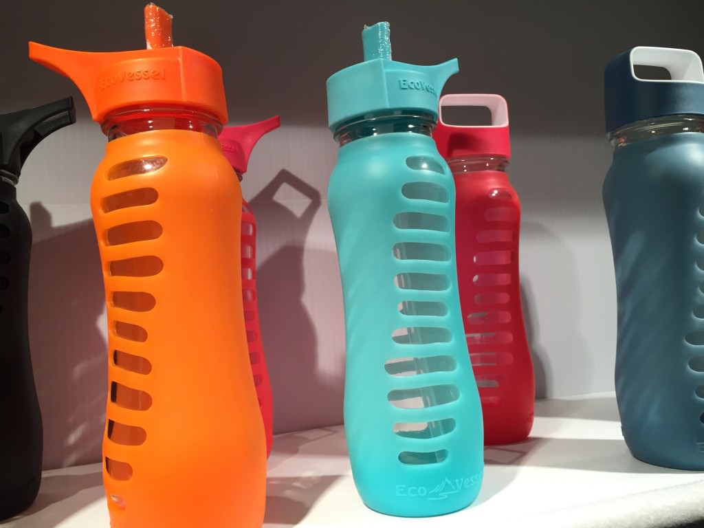 Overview: The Surf line is a glass, 60% recycled glass bottle so it’s not going to have any leaching or any tastes that come through with your beverage. Eco Vessel has surrounded the glass in a silicone reinforcement. They also have a technology here patented called Drop Shield. Drop Shield has a quarter inch of silicone in the base so if it does, which we all do, we happen to drop our bottles from time to time; this has been tested at drops of up to 6 feet. So you can have a nice clean glass bottle and have it be durable.
