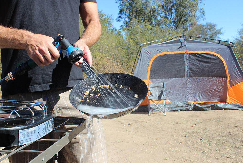 Weekend warriors get dirty, and so do their kids. Whether it’s mountain biking or backwoods hiking, going all out often means mud. At the campsite you’re left with very few options to clean up. Sure, you can use a gallon jug of water, but it’s wasteful and what you really need is a pressurized nozzle on a hose.