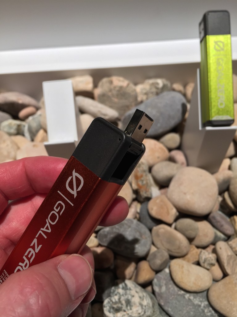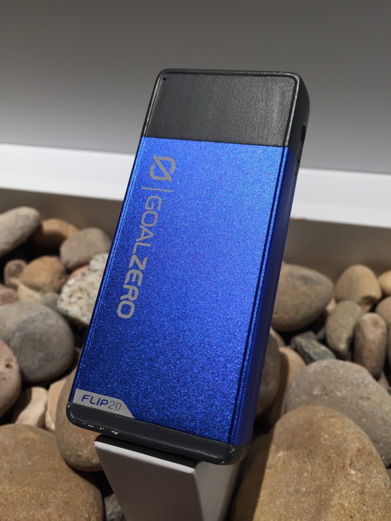 You’re looking at about a 2600 milliamp hours and so you’re getting about a full charge on a cell phone or a couple of charges on a camera, stuff like that. Really handy is the flip out USB tip  which means you don’t need a cable to charge the Flips. That’s a whole bunch of convenient. There’s USB output  at about 1 amp. Push on the USB when it’s flipped in and you get a handy battery indicator. It comes in a bunch of really rad colors and an affordable price point of $29.99.
