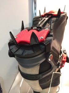 The third most popular model is the Trail Crampon Pro. As you can see, this has a two centimeter long spike, and so it’s a lot more aggressive. It’s a good option for light mountaineering. It has the anti (name – 1:37) which prevents snowy buildup and then adjustable plate so you can adjust it to any size shoe. We’ve also got the ratchet buckle system which operates like a snowboard buckle.