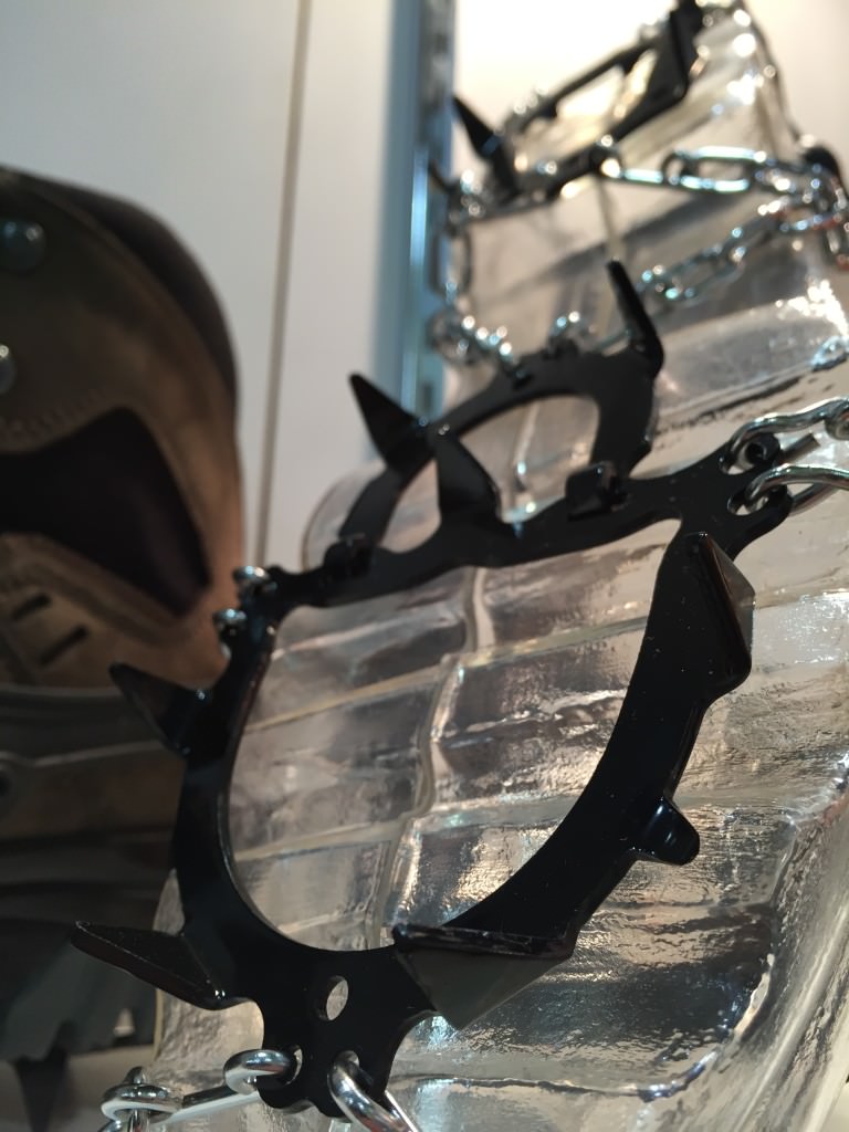 The third most popular model is the Trail Crampon Pro. As you can see, this has a two centimeter long spike, and so it’s a lot more aggressive. It’s a good option for light mountaineering. It has the anti (name – 1:37) which prevents snowy buildup and then adjustable plate so you can adjust it to any size shoe. We’ve also got the ratchet buckle system which operates like a snowboard buckle.