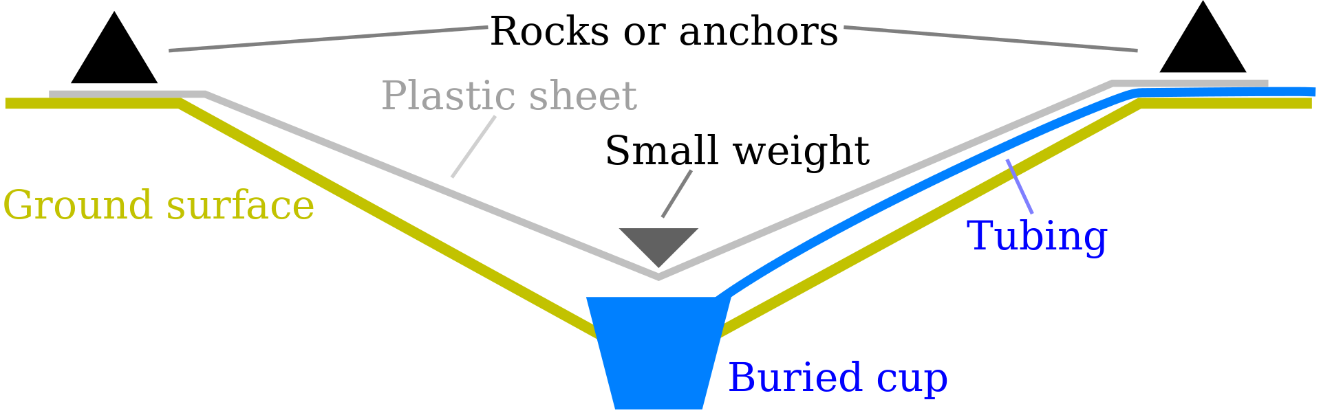 The above-ground version works best in an area with lots of vegetation, by collecting water from plants – the water vapor that is given off when green leaves photosynthesize. The still is called an evaporation or transpiration still.