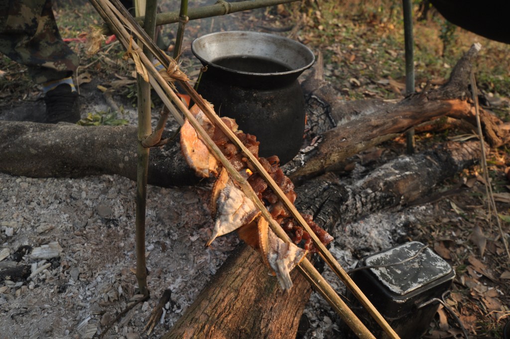 Cut up and hang the meat above the fire, in the same way as for air-drying. Don’t let it get too hot—you don’t want to cook the meat. Keep the fire fed with green matter to maintain the smoking process. It takes around 24 hours, and the meat should crack when bent, just as with air-drying.