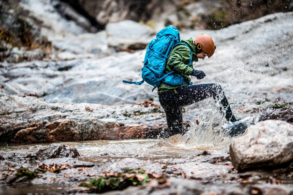 Undo the waist strap of any rucksack and take one arm out – even in knee-deep water. If you hit a hole, a rucksack can drag you under or force you face-down into the water. If you have the backpack half-slung, you can get rid of it if you have to, or use it as a buoyancy aid.
