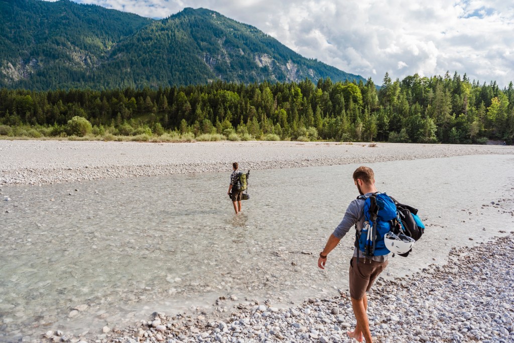 Store your clothes and boots in your backpack, sealed up as much as you can (wrap it up in a bivi sheet or tarp if you have one). This can also double as a buoyancy aid, and you’ll have dry clothes on the other side. If you are wading in the river, keep your boots on to help avoid any sharp rocks on the riverbed.