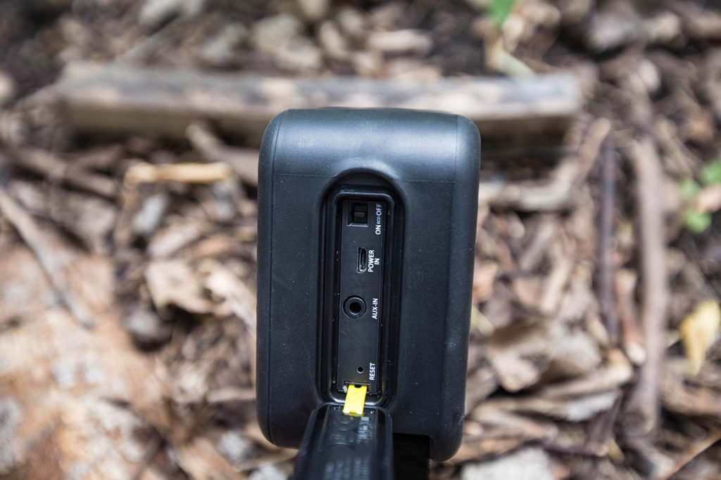 The iHome iBT35 is a rugged speaker.  It is IP67 rated meaning that it’s completely dust tight and waterproof for up to 1 meter/3 feet of water for 30 minutes. In our testing the iHome iBT35 can withstand a typical rain shower at a campsite. The case is sealed and feels heavy, and can withstand small drops from clumsy campers–which is great when you’re camping.