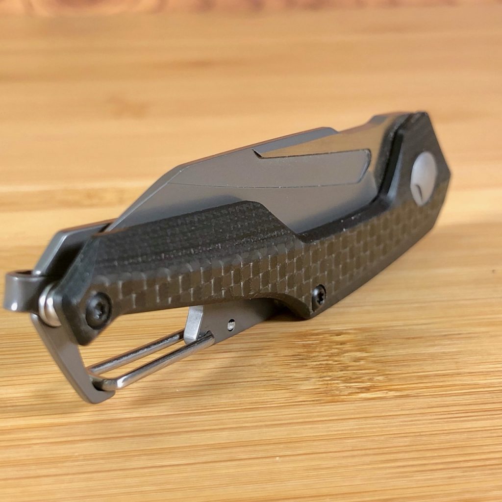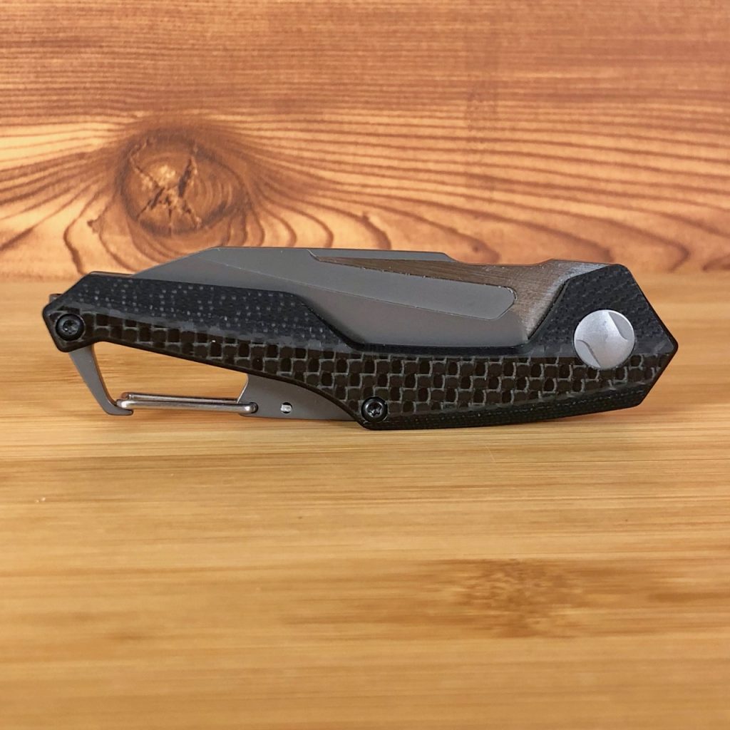 The Kershaw Reverb is a smaller, carabiner-style knife that only weighs 1.6 oz. It has a G10 handle with a carbon fiber overlay that looks great and keeps the knife lightweight. There’s a deep carry pocket clip, and my favorite part of the knife – the carabiner. I just love being able to snap a knife off my belt loop on my hip when I need it. The reason I like the carabiner-style of carry because I always have things in both of my pockets. I don’t want my EDC to scratch up my phone, and my keys are usually in my other pocket. So, for me this style of knife is perfect. The Kershaw Reverb has a 2.5-inch 8Cr13MoV blade that I thought was easy to sharpen. I also like the fact that the frame lock is more accessible than many others. Sometimes you have to dig your fingernail in to close them, but the Reverb is recessed in that area so it’s very easy to use.
