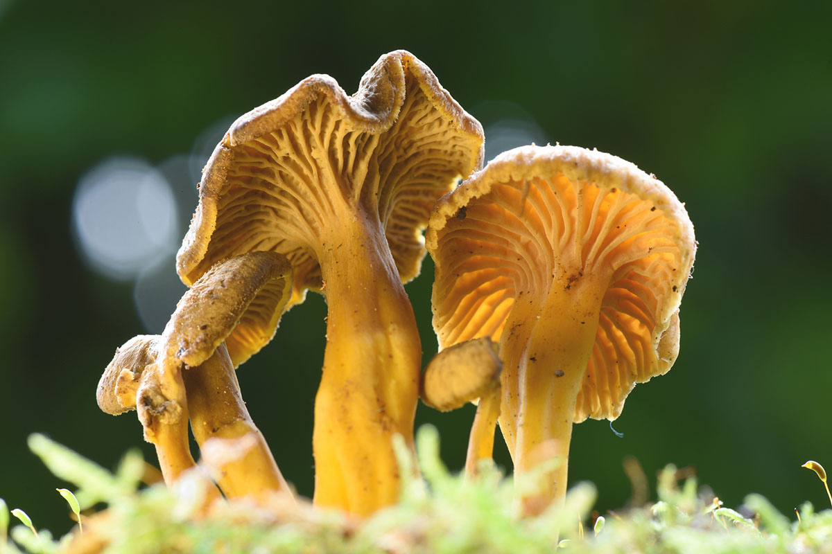 Decorated with the same false gills as chanterelles, yellowfoot chanterelles have a hollow stem and thrive in cold weather. This “funnel chanterelle” has a trumpet-like shape and a yellow-to-orange color. Look for them under coniferous trees or in mixed woodlands.