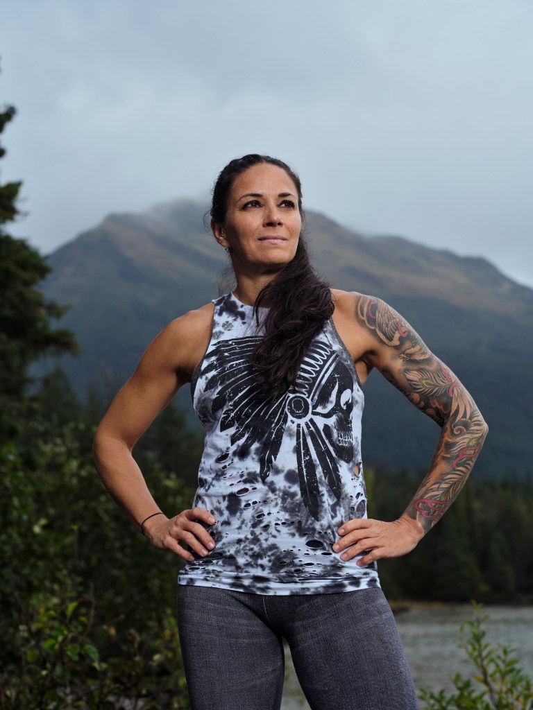 Angie, 30, is proficient with an ax, knives, rifle, handguns and a slingshot, and the shark tattoo on her arm is a reminder of her next goal: to catch a shark.