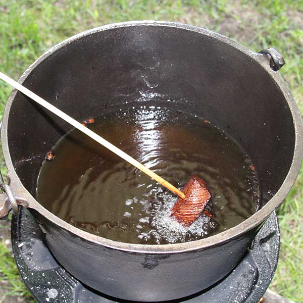 Heat up cooking oil (peanut oil is best) over a camp stove like the EcoZoom portable rocket stove. Use a small, but heavy cast iron kettle on top so that it heats the oil evenly rather than creating a hotspot over the flame. A deep, round bottom kettle works best. Don’t fill it too full—about 1/3 to ½ works best and helps avoid too much spattering. Get the oil temp up to 350-375 F, but no hotter.