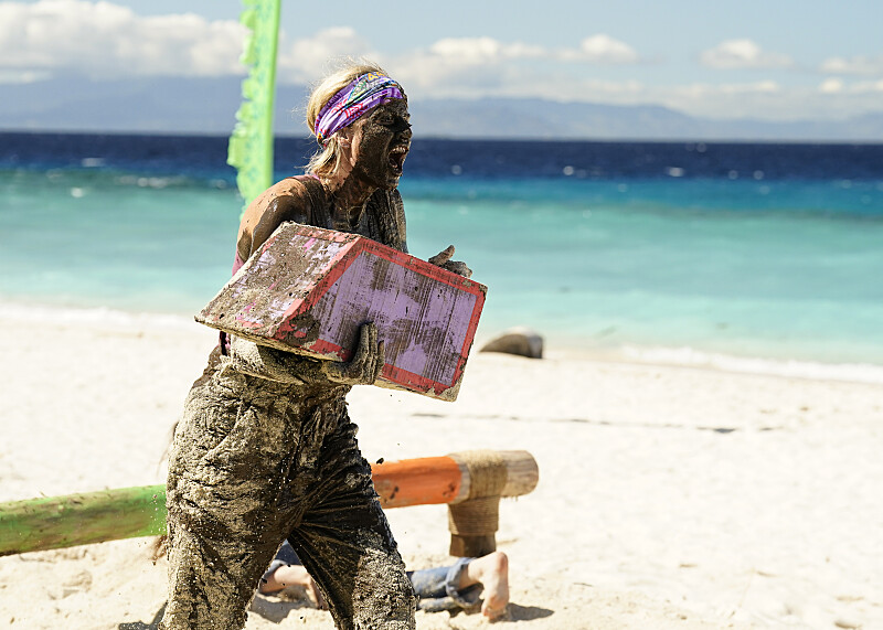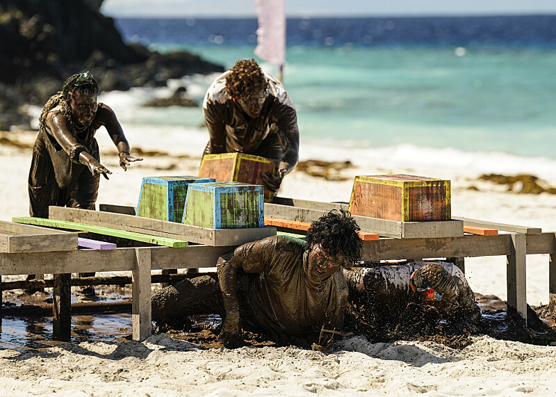 Survivors, ready! The tribes begin the reward challenge and it’s drama from the start. Insurance agent Bruce dives under obstacles and goes face-first into mud. Something is clearly wrong with him as he grabs puzzle pieces and hauls them back. “Nothing is easy on Survivor,” Jeff says, and judging from the blood covering Bruce’s face, he’s not wrong.