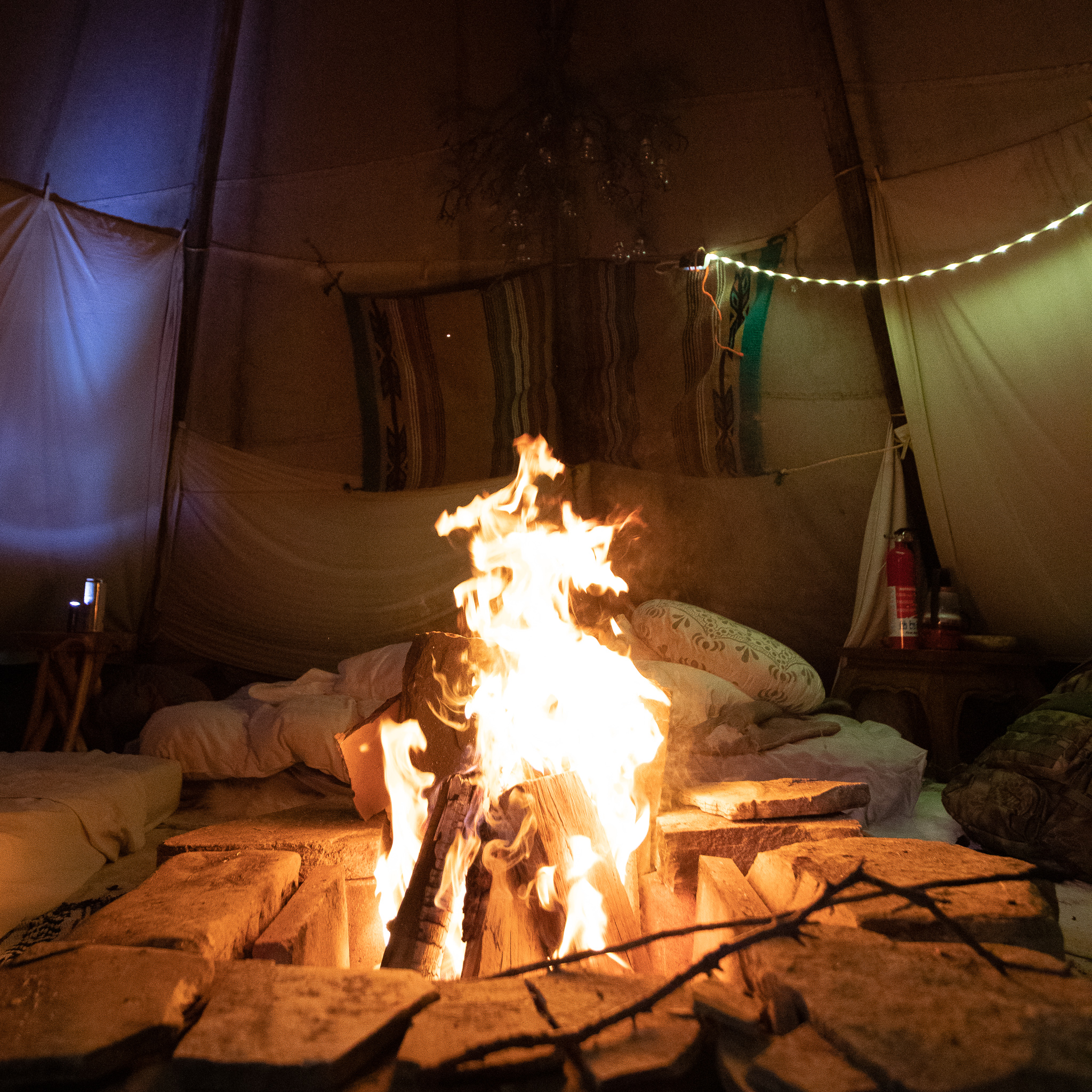 Teepees can be pretty dark in the evening because the canvas doesn’t let as much light through as a nylon tent. We shined our headlamps up on the interior walls, and it made for a seriously chill camp scene. It’s also essential to have lighting for safety reasons because you’re all sleeping around a fire pit. Yes, you can see the fire when it’s burning, but if you get up in the middle of the night, a recessed coal bed is much hard to spot. Make sure the teepee is well lit.