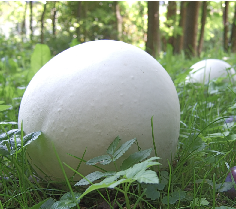This unique sphere mushroom has no open spore cap. Varying in size, big or small, when you kick or squeeze a mature puffball, a dust cloud of spores appears. Most puffballs are safe to eat. Avoid any that are yellow or purple under the white skin, they should be fully white.