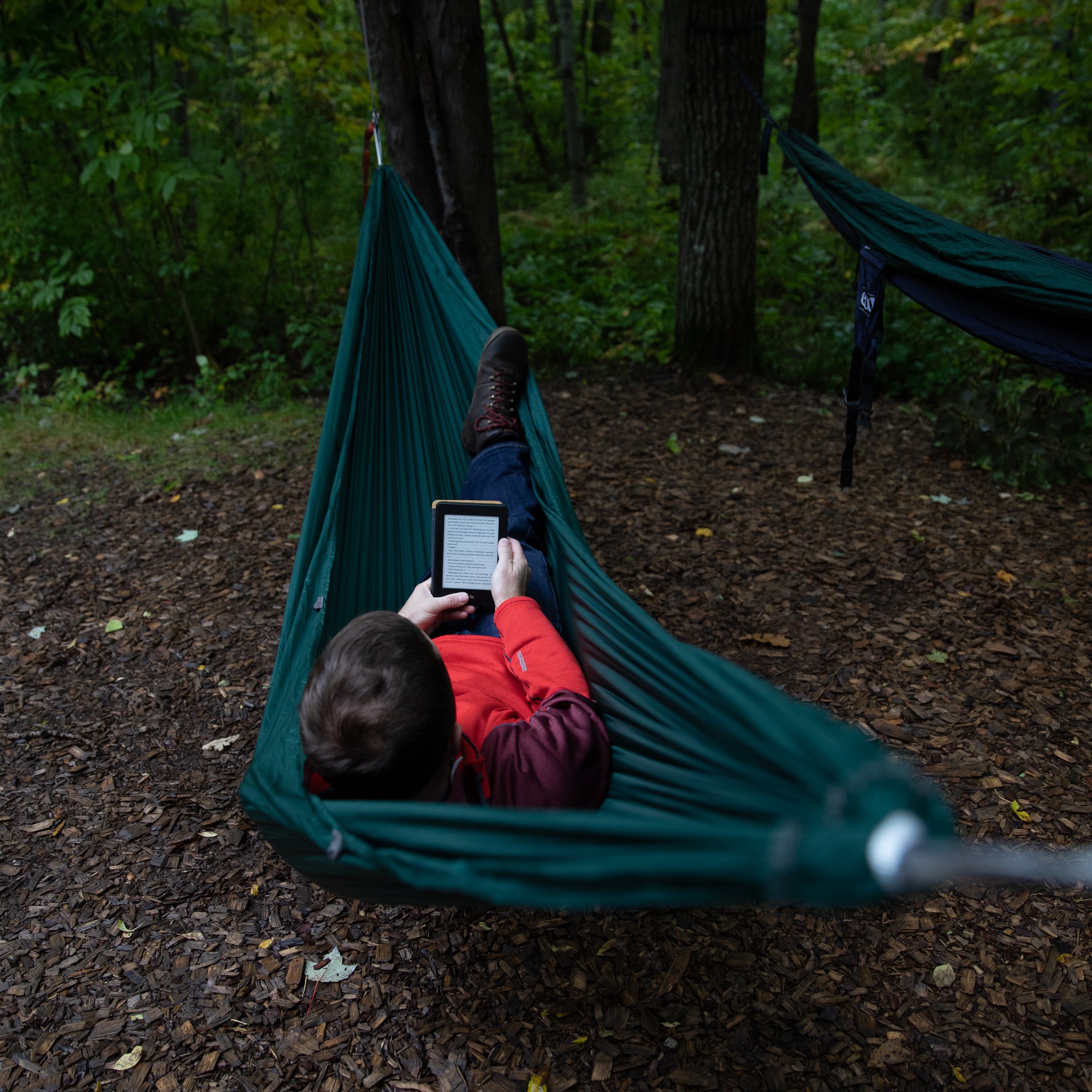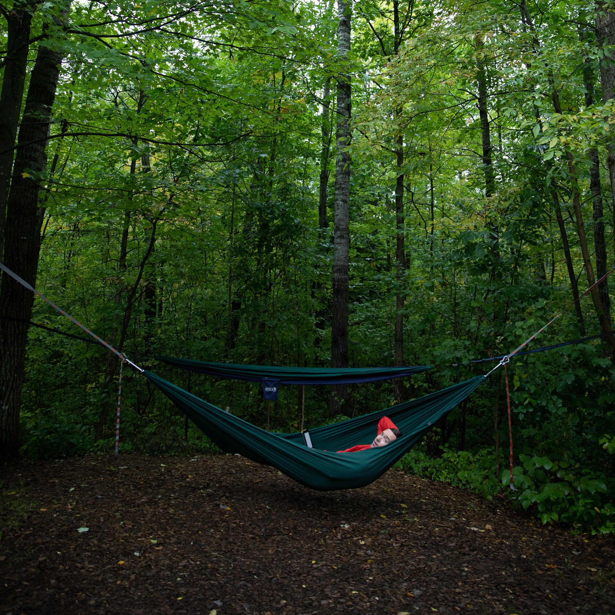 When you lay straight in a hammock, both your feet and head will be uncomfortably elevated. What you need to do is lay at a slight angle. Move your feet to the right and move your head to the left. If you’ve hung your hammock correctly, you’ll find that you can lay nearly flat. You can even lay on your side if you want. Every time I point this out to someone, they’re stunned. “What? I’m WAY more comfortable. Why haven’t I been doing this all along?”