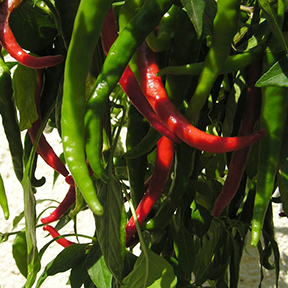 Thai: A tiny, thin pepper with big flavor, the thai chili pepper can be found in both green and red colors that add their unique flavor to thai cuisine. Thai peppers make a great addition for any infusion that needs a quick, intense heat.
